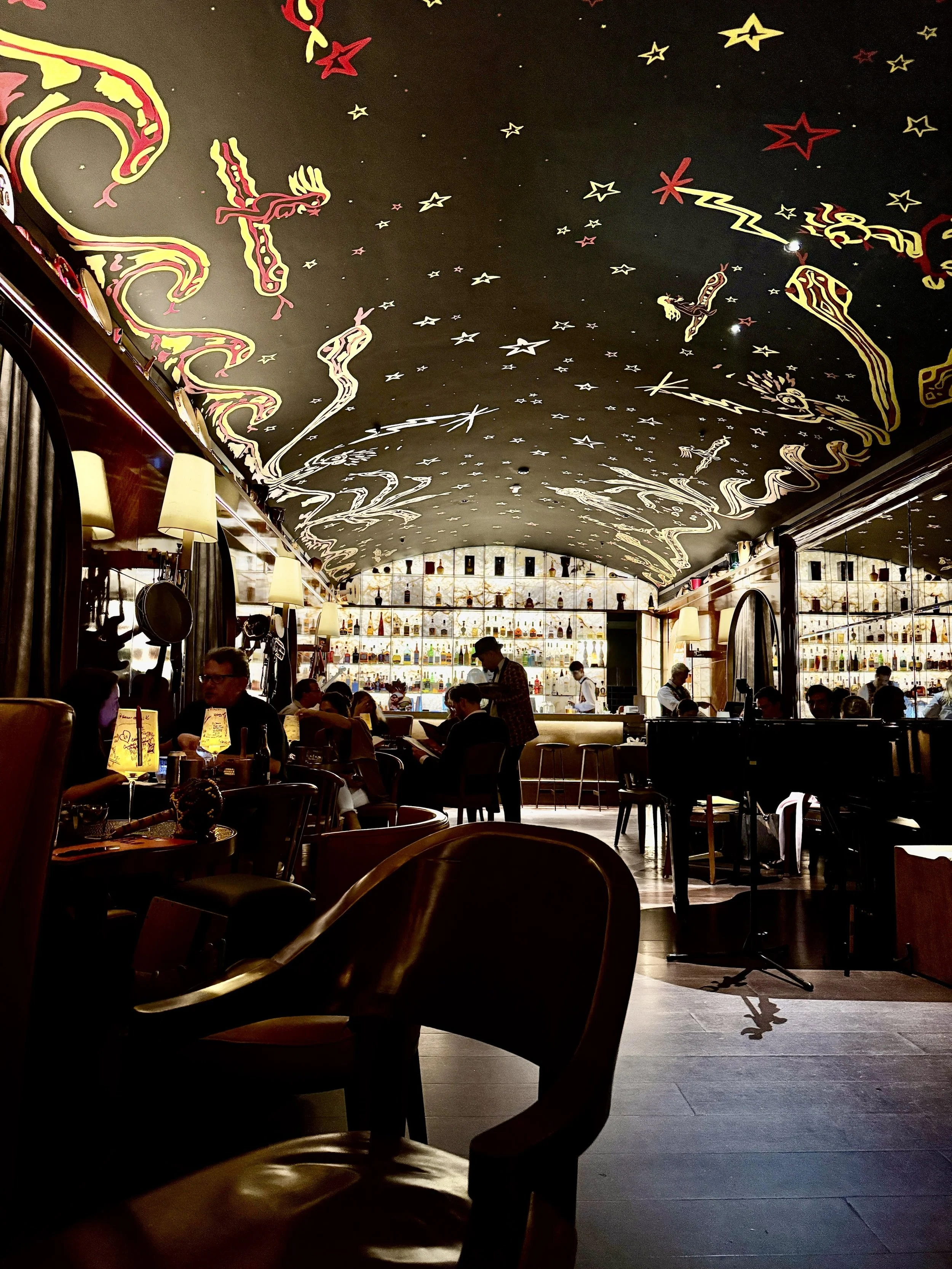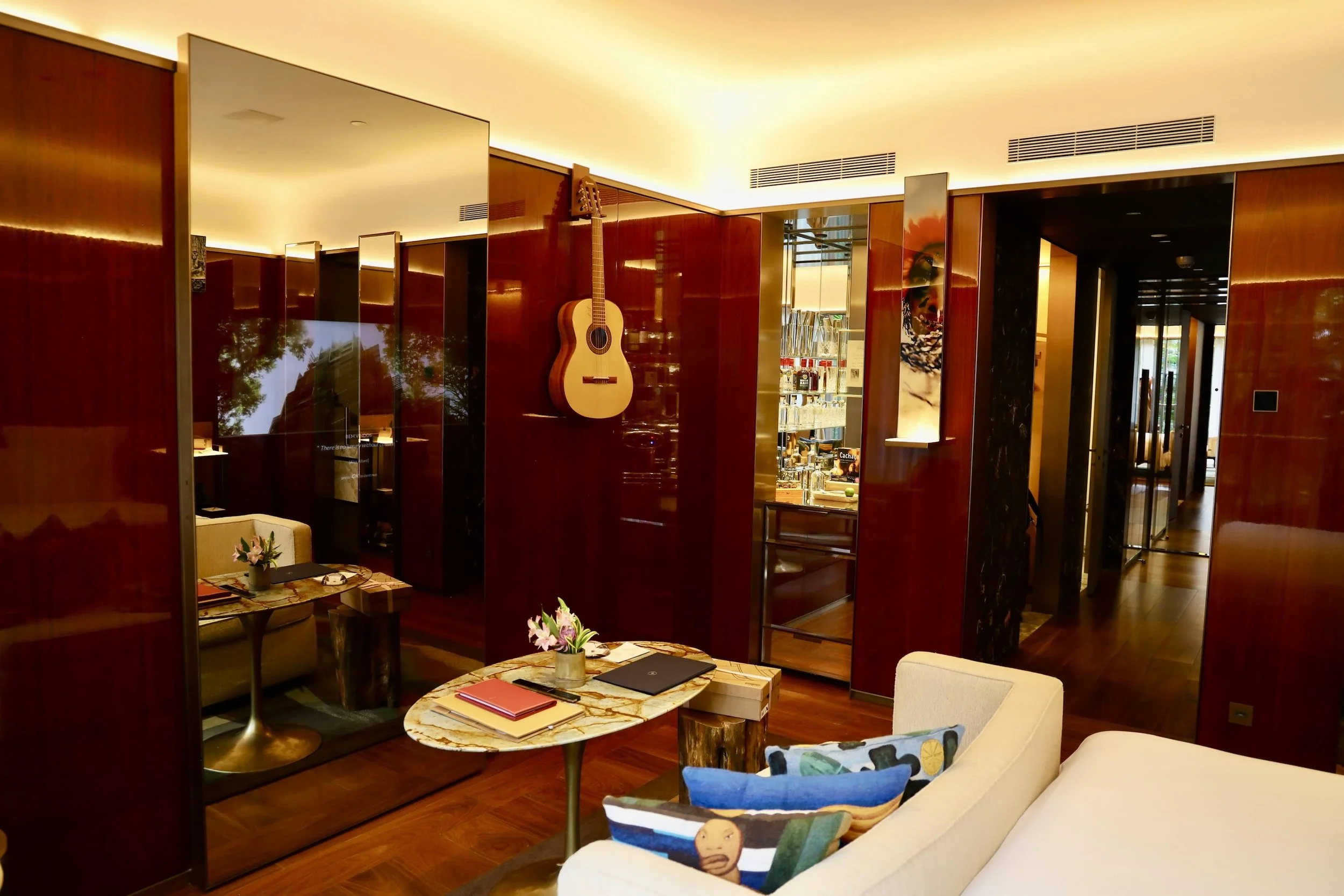Also designed by Starck, the rooms include familiar elements I’ve seen in his other major hotel properties, such as the Hotel Brach and Le Royal Monceau-Raffles, both in Paris: a guitar, art books, glass mirror sliding doors, cherry-hued wood panels, and illustrated wallpaper in the hallways.